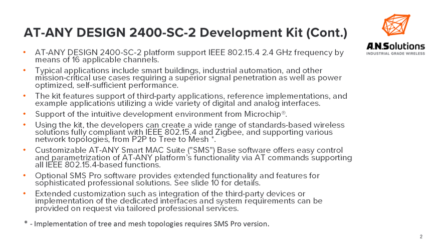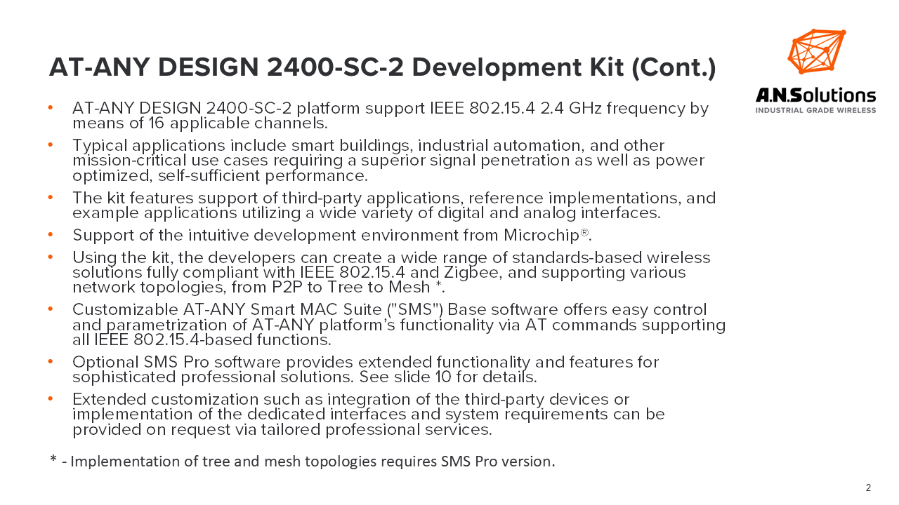 - AT-ANY SMS Pro version facilitates development of complex applications and supports additional tree topologies with static routing, based on IEEE 802.15.4 MAC layer. This allows numerous versatile example applications. SMS Pro also provides additional features such as the data broadcasting and a full function device (FFD) functionality. The data redirect feature enables users to set up tree network topologies. Finally, SMS Pro is designated to be a code base for customer requested extensions.
