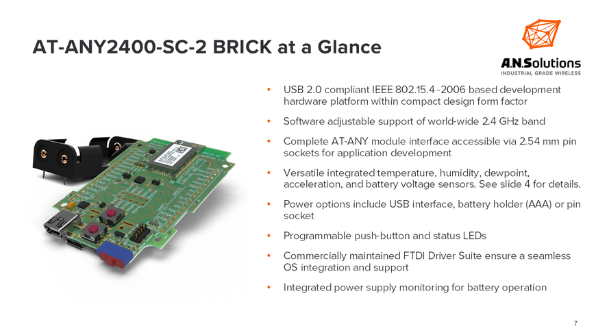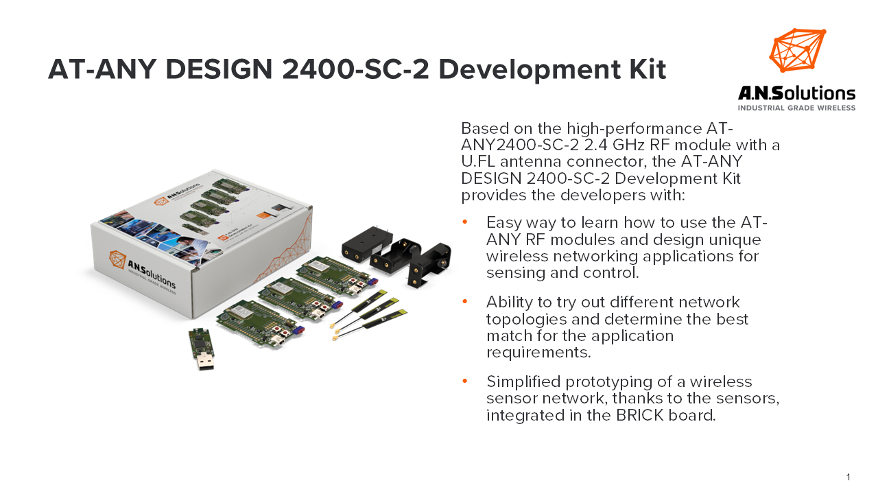 - The BRICK development board is a self-contained sensor node comprising AT-ANY2400-SC-2 module and possessing its RF characteristics.