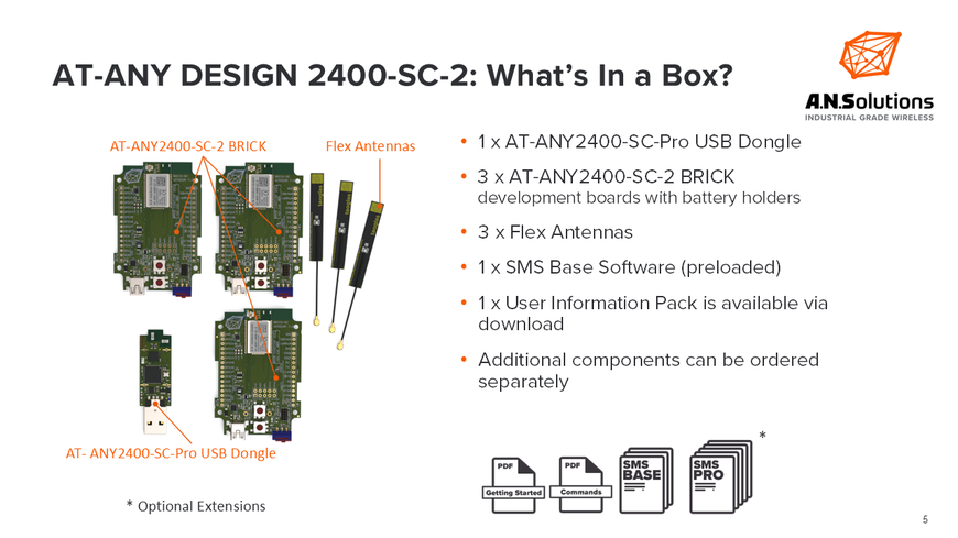 - 3 x AT-ANY2400-SC-2 BRICK development boards with battery holders