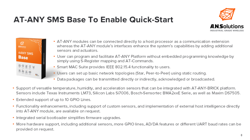- AT-ANY SMS Base version provides essential functionality designed for simple network topologies and evaluation purposes. It can be used to set up a coordinator - end device (star, P2P) topologies.