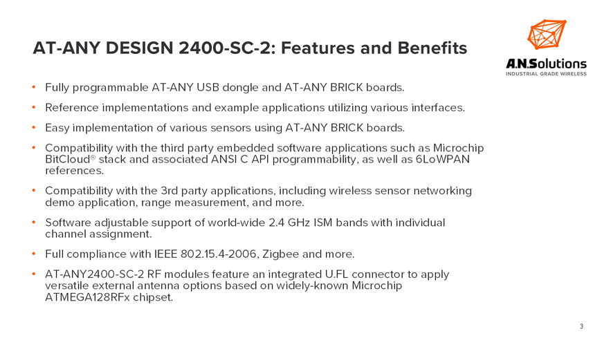 - AT-ANY2400-SC-2 RF modules feature an integrated U.FL connector to apply versatile external antenna options based on widely-known Microchip ATMEGA128RFx chipset