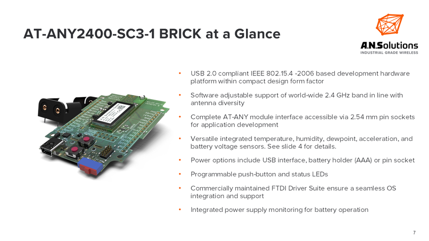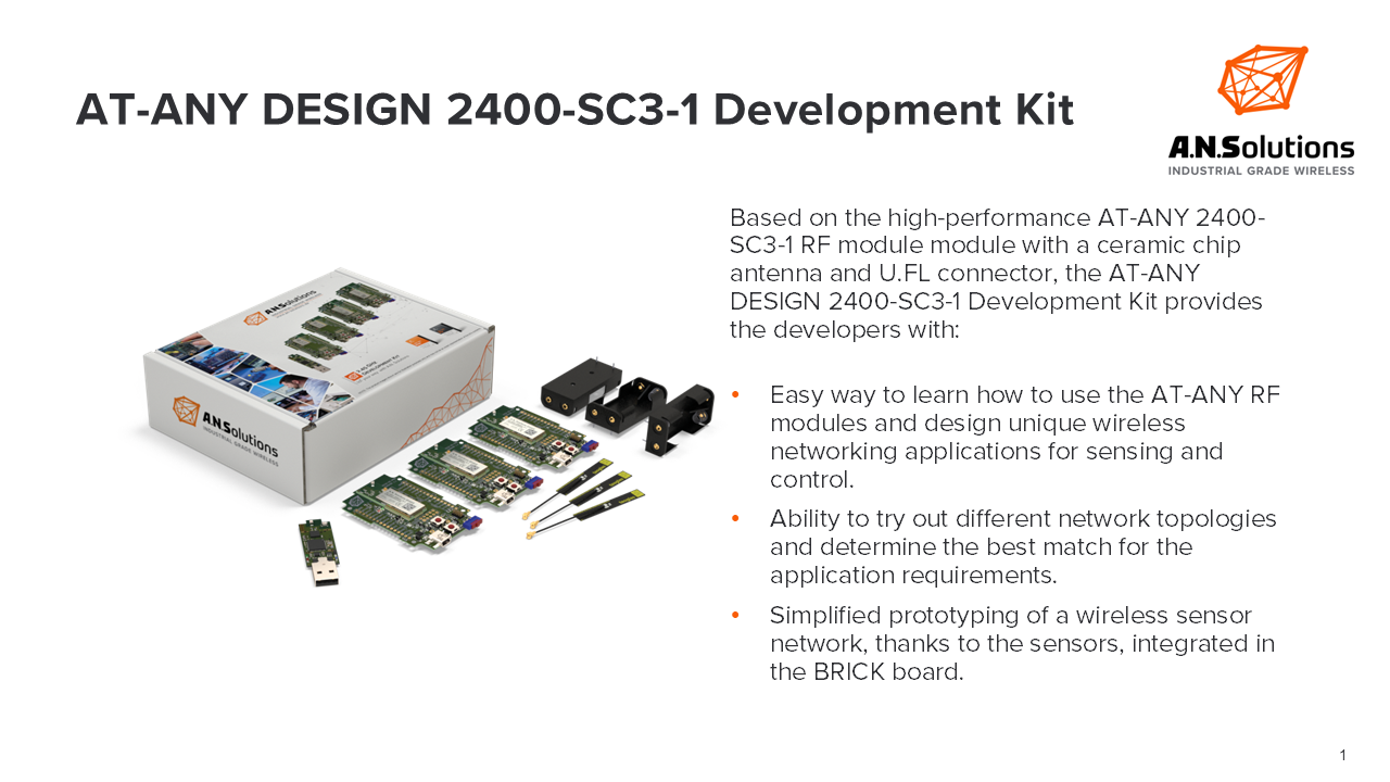 - The BRICK development board is a self-contained sensor node comprising AT-ANY2400-SC3-1 module and possessing its RF characteristics.