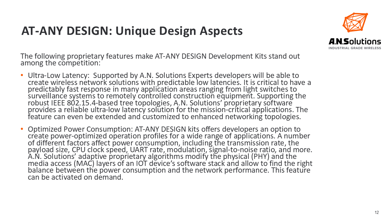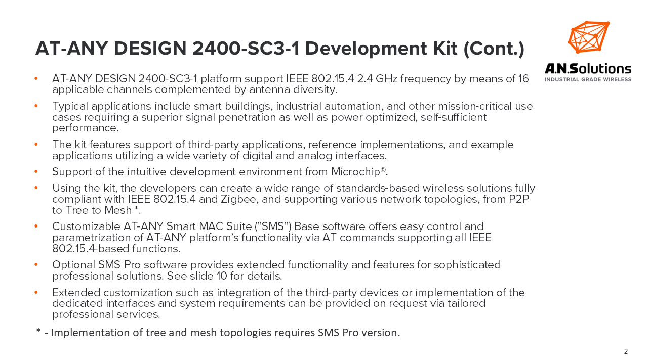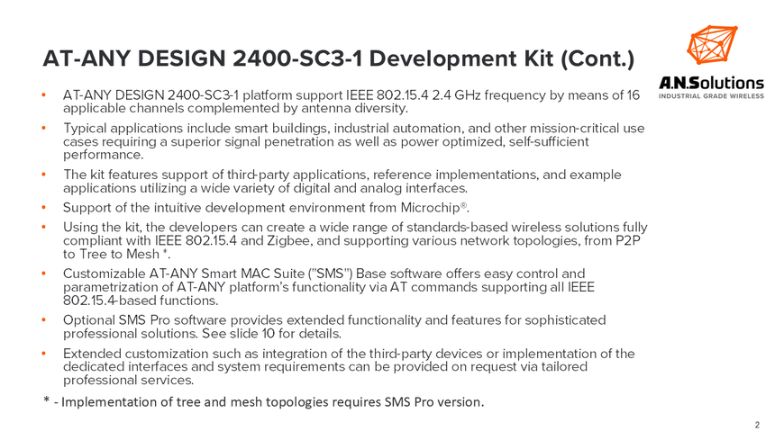 The kit features support of third-party applications, reference implementations, and example applications utilizing various interfaces. AT-ANY DESIGN kit supports the intuitive development environment from Microchip®. Using the kit, the developers can create a wide range of standard-based wireless solutions fully compliant with IEEE 802.15.4, Zigbee, supporting various network topologies, from P2P to tree to mesh. Included in the package, the customizable AT-ANY Smart MAC Suite ("SMS") Base software offers easy control of AT-ANY platform’s functionality via AT commands supporting all IEEE 802.15.4-based functions.