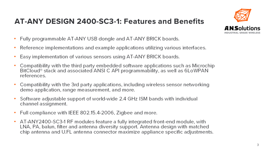 - AT-ANY2400-SC3-1 RF modules feature a fully integrated front-end module, with LNA, PA, balun, filter and antenna diversity support. Antenna design with matched chip antenna and U.FL antenna connector maximize application-specific adjustments