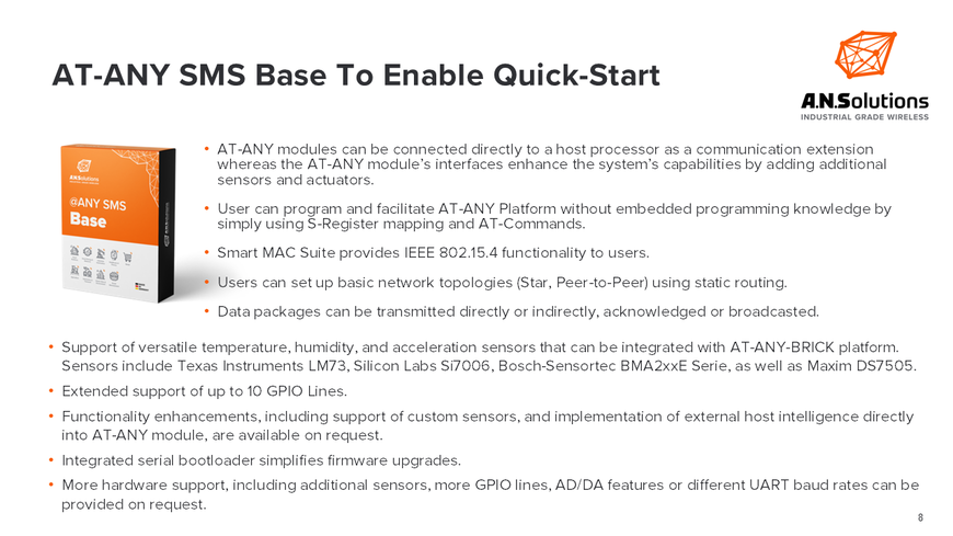- AT-ANY SMS Base version provides essential functionality designed for simple network topologies and evaluation purposes. It can be used to set up a coordinator - end device (star, P2P) topologies.